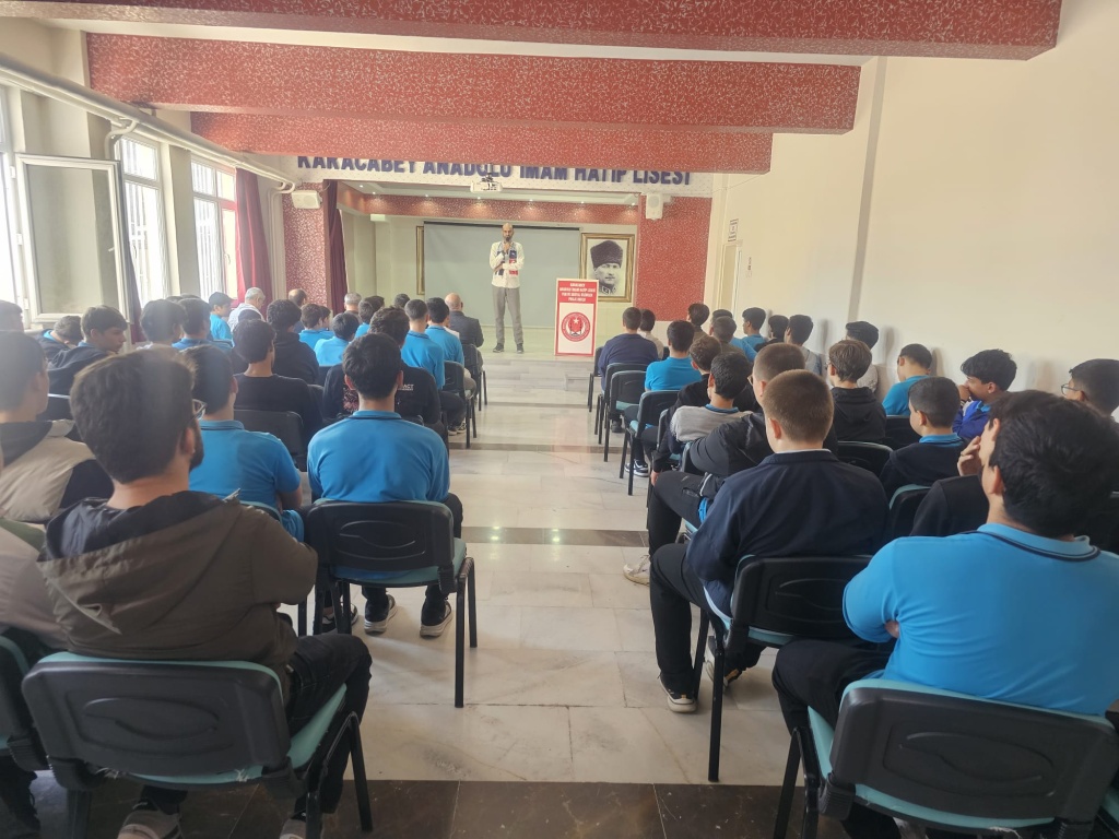 Filistin farkındalık etkinliği kapsamında, Okulumuzdan 1992-1993 Eğitim-Öğretim yılında mezun olan Gazze’nin ve Filistin’in mazlum ve mağdur halkının haklı davasını tüm dünyaya duyurmak ve umut olmak için Sumud filosuna katılan ardından lanetlenmiş toplum olan terör devleti israil tarafından kaçırılan beş gün israil hapishanesinde rehin tutulan Sayın Abdullah GÜNDEM hocamızı KİHMED ( Karacabey İmam Hatipliler Derneği ) aracılığıyla öğrencilerimizle buluşturduk.
